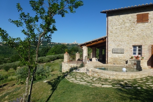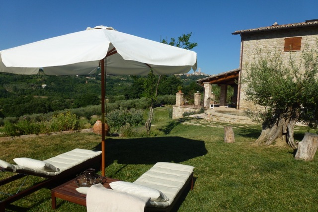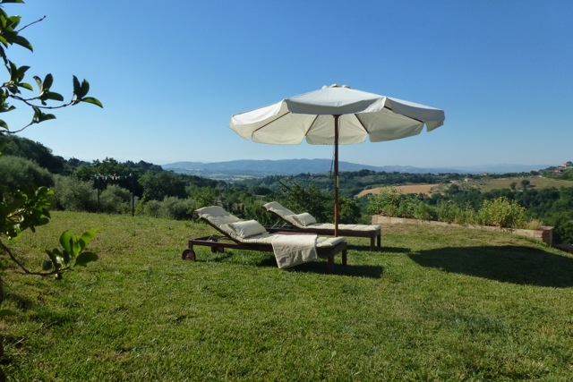 Sonnenliegen und Sonnenschirm stehen am Sitzpool bereit. Außendusche mit Warmwasser. Am eigenen Biogemüsegarten kann man sich gerne bedienen.