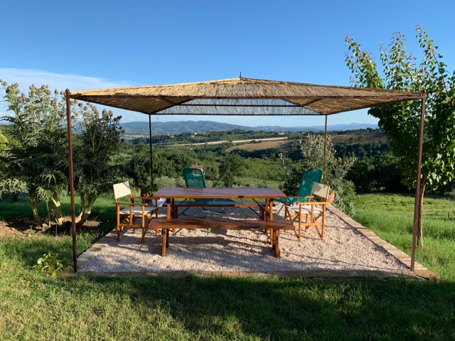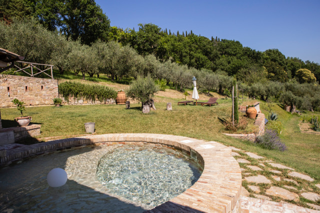 Sonnenliegen und Sonnenschirm stehen am Sitzpool bereit. Außendusche mit Warmwasser. Am eigenen Biogemüsegarten kann man sich gerne bedienen.